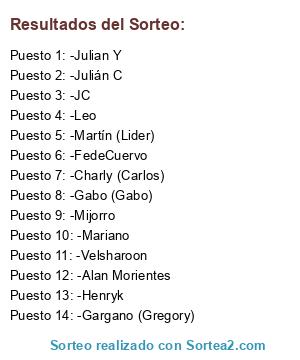Lista de participantes: -JC, -Charly (Carlos), -Gargano (Gregory), -Martín (Lider), -Leo, -Mariano, -FedeCuervo, -Julián C, -Gabo (Gabo), -Velsharoon, -Julian Y, -Alan Morientes, -Mijorro, -Henryk.