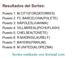 Lista de participantes: M.UNITED(ALOPEZMA), CHELSEA(TONETE), NÁPOLES(JUANMA), M.CITY(FORZATORRES), FC.BARCELONA(POLETE), R.MADRID(LAURELF), BAYERN(FRANJM), VILLARREAL(PICHUFLASH).