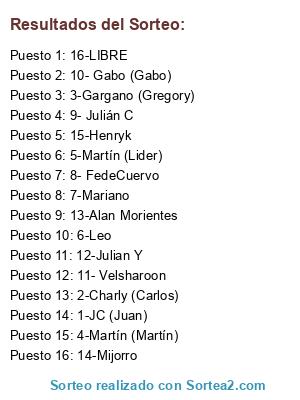 Lista de participantes: 1-JC (Juan), 2-Charly (Carlos), 3-Gargano (Gregory), 4-Martín (Martín), 5-Martín (Lider), 6-Leo, 7-Mariano, 8- FedeCuervo, 9- Julián C, 10- Gabo (Gabo), 11- Velsharoon, 12-Julian Y, 13-Alan Morientes, 14-Mijorro, 15-Henryk, 16-LIBRE.