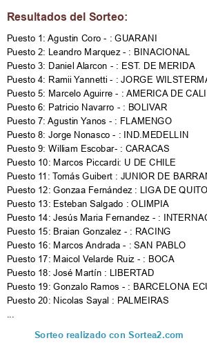 Lista de participantes: Milton Tamaso - : ALIANZA LIMA, Marcelo Aguirre - : AMERICA DE CALI, Ariel Miranda - : GREMIO, Gonzalo Ramos - : BARCELONA ECU., Braian Gonzalez - : RACING, Jorge Nonasco - : IND.MEDELLIN, Mariano Mendoza - : TIGRE, Marcos Andrada - : SAN PABLO, Gabriel Villalba - : RIVER, Agustin Yanos - : FLAMENGO, Leandro Marquez - : BINACIONAL, Patricio Navarro - : BOLIVAR, Enzo Benítez - : COLO-COLO, Jesús Maria Fernandez - : INTERNACIONAL, Alejo Ceccotti - : PEÑAROL, Ramii Yannetti - : JORGE WILSTERMANN, Daniel Alarcon - : EST. DE MERIDA, Tomi Arias - : NACIONAL (U), Carlos Olavarria - : SANTOS, Santiago Smith : ATL.PARANAENSE, Matii Vega - : DEF. Y JUST., William Escobar- : CARACAS, Nicolas Sayal : PALMEIRAS, Agustin Coro - : GUARANI, Maicol Velarde Ruiz - : BOCA, Gonzaa Fernández : LIGA DE QUITO, Danii Cuevas : IND.DEL VALLE, Tomás Guibert : JUNIOR DE BARRANQUILLA, José Martín : LIBERTAD, Diego Bustamante : DELFIN, Esteban Salgado : OLIMPIA, Marcos Piccardi: U DE CHILE.
