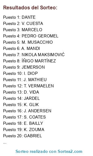 Lista de participantes: K. ZOUMA, M. MUSACCHIO, MARCELO, I. DIOP, S. COATES, DANTE, JARDEL, V. CUESTA, JEMERSON, T. VERMAELEN, A. MANDI, Y. MINA, D. VIDA, E. BAILLY, ÍÑIGO MARTÍNEZ, GABRIEL, PEDRO GEROMEL, J. ANDERSEN, J. MATHIEU, A. MARTYNOVICH, NIKOLA MAKSIMOVIĆ, K. GLIK.