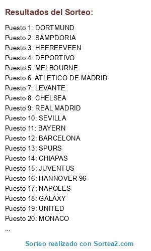 Lista de participantes: LEVANTE, ROMA, SAMPDORIA, ARSENAL, REAL MADRID, PSG, AJAX, MONACO, HEEREEVEEN, BAYERN, MANCHESTER CITY, NAPOLES, MELBOURNE, SPURS, HANNOVER 96, JUVENTUS, DEPORTIVO, SEVILLA, BARCELONA, ATLETICO DE MADRID, ESPANYOL, LIVERPOOL, DORTMUND, EIBAR, CHIAPAS, VITESSE, GALAXY, CHELSEA, MALLORCA, VILLARREAL, VALENCIA, UNITED.
