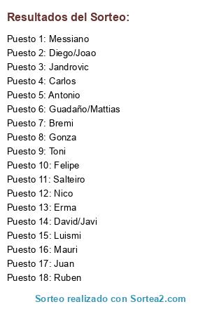 Lista de participantes: Juan, Felipe, Nico, Carlos, Antonio, Erma, Salteiro, Toni, Mauri, Luismi, Bremi, Gonza, Jandrovic, Ruben, Messiano, David/Javi, Diego/Joao, Guadaño/Mattias.