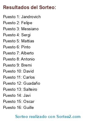 Lista de participantes: Sergi, Oscar, Toni, Guille, Rubén, Pinto, Javi, Guadaño, Salteiro, Messiano, Luismi, Alberto, Joao, Bremi, Felipe, Antonio, Carlos, David, Jandrovich, Mattias..