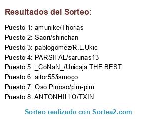 Lista de participantes: ANTONHILLO/TXIN, aitor55/ismogo, amunike/Thorias, Saori/shinchan, _CoNaN_/Unicaja THE BEST, PARSIFAL/sarunas13, Oso Pinoso/pim-pim, pablogomez/R.L.Ukic.
