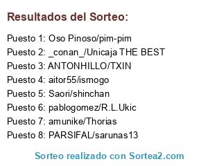 Lista de participantes: ANTONHILLO/TXIN, Oso Pinoso/pim-pim, amunike/Thorias, aitor55/ismogo, pablogomez/R.L.Ukic, _conan_/Unicaja THE BEST, Saori/shinchan, PARSIFAL/sarunas13.