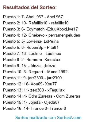 Lista de participantes: 1- Jojeda - Ojeda87, 2- Romrom- Kinectox, 3- Regueril - Manel1982, 4- Cdm Zureras - Cdm Zureras, 5- LoPeina- LoPeina, 6- Edymatch -EduuXboxLive17, 7- Abel_967 - Abel 967, 8- RubenSp - Pitu81, 9- jarr2300 - jarr2300, 10- Rafalillo10 - rafalillo10, 11- zeo360 - xTequilax, 12- Chekevo - perramenpeluden, 13- Luelmo - Luelmoo, 14- Francer0- Francer0, 15- Jfdeza - jfdeza, 16- Xou69- Xou77.