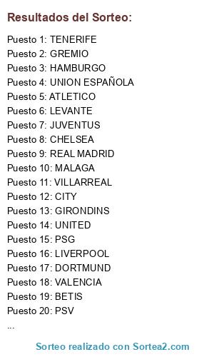 Lista de participantes: BARCELONA, VILLARREAL, BETIS, TENERIFE, GIRONDINS, WEST HAM, VALENCIA, MALAGA, HAMBURGO, VENEZIA, NAPOLES, PORTO, GIRONA, REAL MADRID, CITY, UNITED, DEPORTIVO, LEVANTE, LIVERPOOL, TOTTENHAM, MOUSCROM, PSG, LEICESTER, GREMIO, PSV, DORTMUND, TIGRES, UNION ESPAÑOLA, JUVENTUS, CELTIC, CHELSEA, ATLETICO.