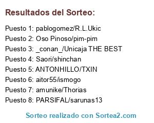 Lista de participantes: ANTONHILLO/TXIN, Oso Pinoso/pim-pim, amunike/Thorias, aitor55/ismogo, pablogomez/R.L.Ukic, _conan_/Unicaja THE BEST, Saori/shinchan, PARSIFAL/sarunas13.