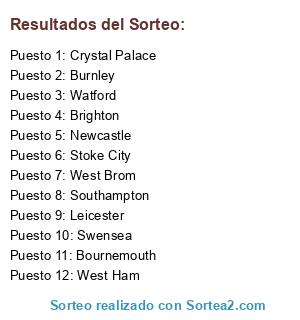Lista de participantes: Bournemouth, Brighton, Burnley, Crystal Palace, Leicester, Newcastle, Southampton, Stoke City, Swensea, Watford, West Brom, West Ham.