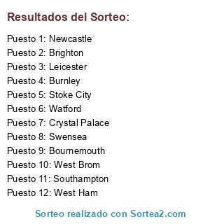 Lista de participantes: Bournemouth, Brighton, Burnley, Crystal Palace, Leicester, Newcastle, Southampton, Stoke City, Swensea, Watford, West Brom, West Ham.