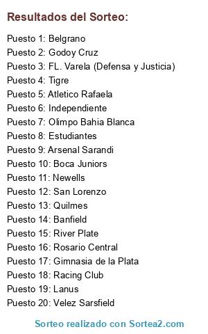 Lista de participantes: Olimpo Bahia Blanca, Banfield, Belgrano, Boca Juniors, Estudiantes, FL. Varela (Defensa y Justicia), Gimnasia de la Plata, Godoy Cruz, Independiente, Lanus, Newells, Quilmes, Racing Club, Atletico Rafaela, River Plate, Rosario Central, San Lorenzo, Arsenal Sarandi, Tigre, Velez Sarsfield.