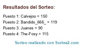 Lista de participantes: caarlos10 = 142, Bandido_666_ = 119, Calvejoo = 150, ReXioN = 150, Juanes = 90, The-Foxy = 115.