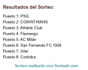 Lista de participantes: Athletic Club, Flamengo, AC Milán, Cordoba, PSG, Inter, San Fernando FC 1904, CORINTHIANS.