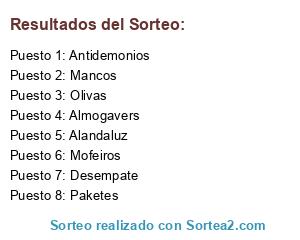 Lista de participantes: Almogavers, Mofeiros, Alandaluz, Mancos, Paketes, Olivas, Antidemonios, Desempate.
