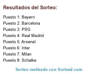 Lista de participantes: Real Madrid, Arsenal, Bayern, Barcelona, Inter, Milan, PSG, Schalke.