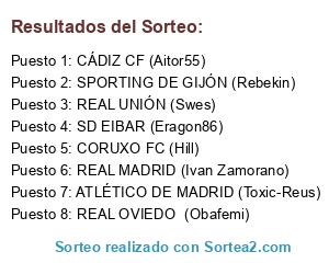 Lista de participantes: SD EIBAR (Eragon86), ATLÉTICO DE MADRID (Toxic-Reus), SPORTING DE GIJÓN (Rebekin), REAL MADRID (Ivan Zamorano), REAL OVIEDO (Obafemi), CÁDIZ CF (Aitor55), REAL UNIÓN (Swes), CORUXO FC (Hill).
