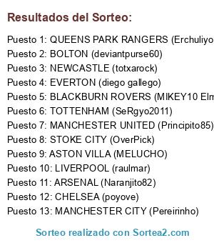Lista de participantes: ARSENAL (Naranjito82), MANCHESTER CITY (Pereirinho), MANCHESTER UNITED (Principito85), CHELSEA (poyove), TOTTENHAM (SeRgyo2011), ASTON VILLA (MELUCHO), LIVERPOOL (raulmar), EVERTON (diego gallego), BOLTON (deviantpurse60), STOKE CITY (OverPick), QUEENS PARK RANGERS (Erchuliyo 24), NEWCASTLE (totxarock), BLACKBURN ROVERS (MIKEY10 ElmalO).