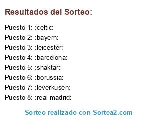 Lista de participantes: :leverkusen:, :celtic:, :barcelona:, :borussia:, :real madrid:, :leicester:, :shaktar:, :bayern:.