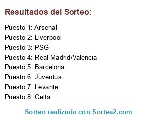 Lista de participantes: Celta, Arsenal, Liverpool, PSG, Levante, Juventus, Barcelona, Real Madrid/Valencia.