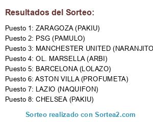 Lista de participantes: CHELSEA (PAKIU), LAZIO (NAQUIFON), OL. MARSELLA (ARBI), PSG (PAMULO), ASTON VILLA (PROFUMETA), MANCHESTER UNITED (NARANJITO), ZARAGOZA (PAKIU), BARCELONA (LOLAZO).