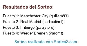 Lista de participantes: Friburgo (patzytoro), Werder Bremen (varomt), Manchester City (guillem93), Real Madrid (carloxdim1).
