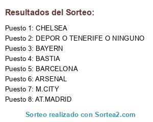 Lista de participantes: CHELSEA, BARCELONA, BAYERN, M.CITY, ARSENAL, AT.MADRID, BASTIA, DEPOR O TENERIFE O NINGUNO.