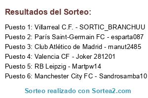 Lista de participantes: Club Atlético de Madrid - manut2485, Manchester City FC - Sandrosamba10, París Saint-Germain FC - esparta087, RB Leipzig - Martpw14, Valencia CF - Joker 281201, Villarreal C.F. - SORTIC_BRANCHUU.