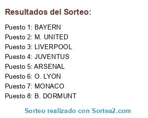 Lista de participantes: M. UNITED, O. LYON, JUVENTUS, LIVERPOOL, BAYERN, ARSENAL, B. DORMUNT, MONACO.