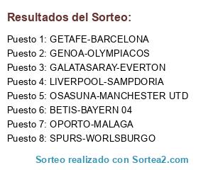Lista de participantes: GALATASARAY-EVERTON, SPURS-WORLSBURGO, OPORTO-MALAGA, GETAFE-BARCELONA, LIVERPOOL-SAMPDORIA, GENOA-OLYMPIACOS, BETIS-BAYERN 04, OSASUNA-MANCHESTER UTD.