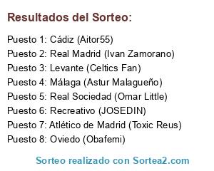 Lista de participantes: Las Palmas (Turu Flores), Oviedo (Obafemi), Real Madrid (Ivan Zamorano), Lleida (Boibi2), Eibar (Eragon86), Levante (Celtic Fans), Real Unión (Swes), Real Sociedad (Omar Little).