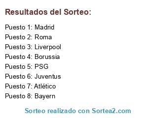 Lista de participantes: Bayern, Atlético, PSG, Madrid, Liverpool, Borussia, Roma, Juventus.