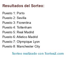 Lista de participantes: Manchester City, Atletico Madrid, Porto, Olympique Lyon, Fiorentina, Real Madrid, Tottenham, Sevilla.