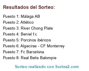 Lista de participantes: River Chong Plate, Real Betis Balompie, Algeciras - CF Monterrey, Porcinos ibéricos, Beniel f.c, Málaga AB, Fc Barcelona, Atlético.