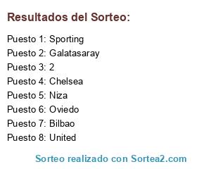 Lista de participantes: Sporting, 2, Niza, Oviedo, Galatasaray, Bilbao, Chelsea, United.