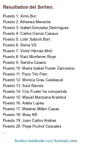 Lista de participantes: Vicente Moliner Canos, Paco Tito Pam, Ximo Bur, Cris Fuster ha compartido , Pepe Puchol Cascales , Sam Demos , Alicia Sanchis Pizá, Minerva Sanchis Pizá , Juan Ramon Pallares , Adel Alg, Dani Gil, Monica Grau Calatayud, Mayka Menero, Athenea Menerós, Lolin Saborit Bort, Flores Soriano Rodríguez , Raul Monferrer Royo, Victor Herraiz Miró , Melanie Millan Casas, Miquel Manzana Arambul , Saúl Ramos , Carlos Garcia Casaus , Juan Carlos Ferrandis Adsuara, Sònia VS, Mary AR, Sandra Casero , María Isabel Fuster Zamorano, Juan Carlos Andres, Isabel Gonzalez Dominguez, Adela Lupea, Vicente Javier Prior Muñoz , Toni Catalan.