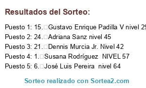 Lista de participantes: 1. Susana Rodríguez NIVEL 57, 2. Osa Mayor Nivel 51, 3. Giovana León Nivel 126, 4. Rucas Castro nivel 61, 5. Charo Rodríguez Nivel 67, 6. José Luis Pereira nivel 64, 7. Mónica Sol Ben nivel 70, 8. Marisela Oroneta Nivel 57, 9. Ddai Dragón Nivel 54, 10. Yolanda García nivel 58, 11. Montchiponchi Po nivel 64, 12. Lola Cerrudo Téllez nivel 44, 13. Clau Mos nivel 56, 14. Luisa Pérez Nivel 63, 15. Gustavo Enrique Padilla V nivel 29, 16. Tamara Vallejos nivel 39, 17. Gigi Nery Gutiérrez Nivel 39, 18. Lola Sánchez Mañani Nivel 51, 19. Claudia Vaz nivel 58, 20. Lupiz Dávila Gómez nivel 63, 21. Dennis Murcia Jr. Nivel 42, 22. Gloria Fdz Nivel 61, 23. Clap Violín Nivel 43, 24. Adriana Sanz nivel 45, 25. Silvia de Marco nivel 31.