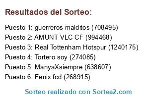 Lista de participantes: Tortero soy (274085), Real Tottenham Hotspur (1240175) , ManyaXsiempre (638607), AMUNT VLC CF (994468) , guerreros malditos (708495), Fenix fcd (268915).