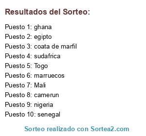 Lista de participantes: Mali, Togo, egipto, camerun, coata de marfil, senegal, sudafrica, nigeria, ghana, marruecos.