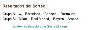 Lista de participantes: - Real Madrid, - Bayern, - Dortmund, - Chelsea, - Milan, - Arsenal, - Barcelona, - X.