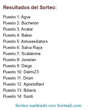 Lista de participantes: Bucheton, Drian, Jonatan, Salva Raya, Astusexiliators, Delmi23, Bdavis, Baker, Apostoflant, Diego, Avatar, Scalabrine, Santi, Agus.