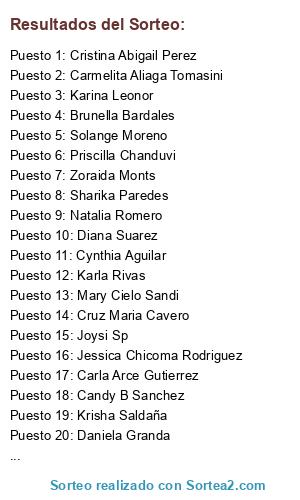 Lista de participantes: Mishel Noriega, Guicela Trinidad, Xime Garcia, Irene Urcia, Mari ROssi, Melissa Bere, Mirella Domirett, Danikaa Sainz, Edith Soria, Karla Medina, Malu Pantoja, Marcela Mejia, Mariana Benites, Cruz Maria Cavero, Maria Gracia Alarcon, Brillit Carhuas, Priscilla Chanduvi, Candy B Sanchez, Rocio Soto, Maria Nitha Sanchez, Fabiola Amaranta, Paola Martinez, Emily Soto, Jesica Leon, Miluska Chavez, Jennifer Pg, Rosasana Zevallos, Brigitte Sotelo, Pilar Cornejo, JAel Blas, Carolina Carrizales, Yolanda Torres, Maggie Hrz, Mary Rojas, Carla Navarro, Lu Bravo, Samantha Alexandra, Karen Guisella Cruz, Jackelyne Francesca, Gladys Castillejo, Grace Suarez, Andrea Towers, Maritza Fernandez, Tamara Molina, Gladys Yovera, Claudia Atocha, Lesly Oliva, J Pablo Sanchez, Anna Melgar Maurtua, Isa Sanchz, Ana Aniithaw, Alicia Guerre, Dree Hwang, Ana Lucia Zegarra, Giovanna Cespedes, Jiannyna Escudero, Milagros Cj, Carmelita Aliaga Tomasini, Noelia Leon, Zoraida Monts, Maria Gracia Muñoz, Maria Teresa Muños, Fiorella Ludeña, Pilar Cornejo Quintana, Victoria Moran, Ariana Ortiz Merlin, Carbar Angie, Melissa Ponte, Karla Brenneisen, Ana Maria C. oxas, Khya Aguilar, Claudia Milene, Claudia M. Leon, Ana carolina Cespedes, Valentina Maria Calderon, Birgitt E. Conejo, Maria Zafra Lapatnikova, Andrea Baumann, Cristina Abigail Perez, Yosily Chalco, Bustamante Eliza, Vanessa Condor, Jacqueline Navarro, Shirley Gomez, Diana Flores, Milagros Stephanie Prado, Caro Castro, Francesca Franco Camper, Diana Karina, Cielo Castañeda, Perla De Díaz, Lu Valverde, Sharika Paredes, Mary Cielo Sandi, Alexandra Alarcón, Sophie Figueroa, Melinna Guzman, Diaz Leslie, Ingrid Madelein, Liliana Gamero, Calderon Guillermina, Gianella Paz, Diana Suarez, Daniela Xiomara, Criistina Ramiirez, Valeria Rubio, Ari Medrano, Andrea Villanueva, Andreita GP, Keysi Curo, Celia Quispe, Leydi Diana, Korinthia Lorieth Sandy, Luz Soto, Joselyn Salvador, Cecilia Del Carmen, Kattia Lazaro, Viko Pineda, Maricielo Valeria, Melanie Grados, Dayanna Arias, Estefy Cruz Delgado, Mercedes Delgado, Liana Angelica Gomez, Nuria Diaz, Escarlet Ct, Daniela Quezada, Krisha Saldaña, Anahi Vargas, Mercedss Cardoso, Ldia Vega, Alice Villamonte, Carla Centti, Lizasandra Herrera, Sandra Camacho, Leslie Silva, Paloma Salazar, Shirley Faniola Aquino, Naydda Flores, Abi Carmona, Camila Susano, Joysi Sp, Alicia s Alvarado, Solange Moreno, Daniela Sanchez, Ani Rebeca, Gianella Cerquera, Natalia Romero, Paulett Delgado, Alexandra noeia Zavaleta, Jessica Chicoma Rodriguez, Janet Puppo, Carla Arce Gutierrez, Katherina Maria Medina, Josellyn Ortiz, Kittie Estrada, Thauny Palomino, Escarlet CT, Djanira Chichizola, Selene Rojas, Brunella Bardales, Diana Arroyo, Tessy k Gonzales, Katiuska A Osorio, Dianita D Valles, Karla Rivas, Seilly Villanueca, Debora Risco, Indira Aliaga, Solange Lapeyre, Anne Murga, Lissrtte Rosario Rodriguez, Cecilia Durant, Katha Maghella, Alicia Pachas, Maria Jimena Vasquez, Monica Cueto, Teresa Hudtwalcker, Mishel Noriega Delgado, Antonella Cayo, Daniella Isasi, Gianella Larrañaga, Rosario Chiclayo, Gannina Zapata, Paola Sayas, Susana Bernadette, Daniela Granda, Gonzales Lidia, Veronika Jorquera, Karla Lizeth, Carolina Pelaez, Karina Leonor, Carolina Oliva, Laly Salazar, Cynthia Potesta, Nadia Olenka Rosales, Maria Pia Calderon, Tere Alvarez, Thais Andorno, Ana Carolina Salazar, Romina Requena, Rossana Cayo, Carla Risi, Fabiana Lopez, Maria Fernanda Castro, Alexa Gil, Anita Salas Laynes, Thais Alcandre, Diana Villavicencio, Nathy Granda, Simone Paz, Angie Urtecho, Jasmin Ingrid, Cynthia Aguilar, Alison Pilar, Vanessa Alvarez, Andrea Alejandra Pereira.