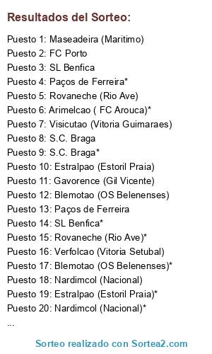 Lista de participantes: FC Porto, SL Benfica, S.C. Braga, Paços de Ferreira, Aratalcao (Académica Coimbra), Arimelcao ( FC Arouca), Blemotao (OS Belenenses), Estralpao (Estoril Praia), Gavorence (Gil Vicente), Maseadeira (Maritimo), Nardimcol (Nacional), Osquancha (Olhanense), Rovaneche (Rio Ave), Esportiva (Sporting Lisboa), Visicutao (Vitoria Guimaraes), Verfolcao (Vitoria Setubal).