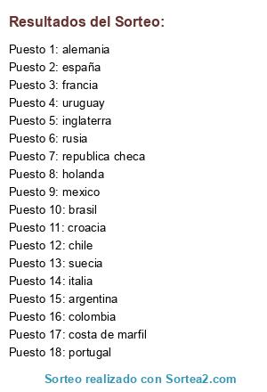 Lista de participantes: españa, brasil, francia, argentina, rusia, inglaterra, mexico, italia, alemania, holanda, portugal, uruguay, republica checa, chile, suecia, croacia, costa de marfil, colombia.