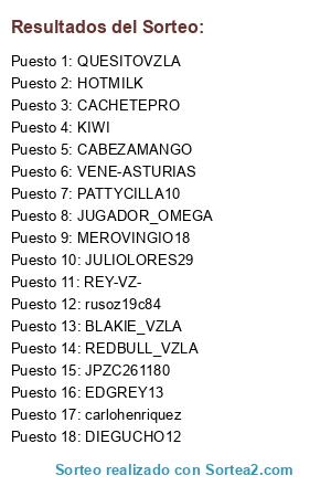 Lista de participantes: carlohenriquez, CACHETEPRO, HOTMILK, DIEGUCHO12, BLAKIE_VZLA, EDGREY13, VENE-ASTURIAS, JPZC261180, JULIOLORES29, KIWI, PATTYCILLA10, QUESITOVZLA, CABEZAMANGO, REDBULL_VZLA, MEROVINGIO18, rusoz19c84, JUGADOR_OMEGA, REY-VZ-.