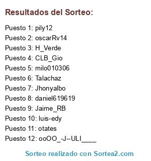 Lista de participantes: CLB_Gio, daniel619619, Talachaz, milo010306, pily12, luis-edy, Jaime_RB, Jhonyalbo, oscarRv14, H_Verde, otates, ooOO_-J--ULI____.