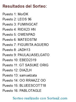 Lista de participantes: JADH13, FIGURITA AGUERO, samuelzata, MorDK, RIOX23 HN, FUMINGCAT, EBED2319, OO RRAAZZ OO, LEOS 96, DIAZLH, BLUEESCOTT18, MATEOSTM, PAULALIASELGATO, OWENPAD, PABLOTAGLE, GT SASUKE ORIG.