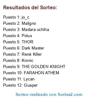 Lista de participantes: Lycan , Madara uchiha, René Killer, Polux , Guaper , Maligno , jo_c , FARAHON ATHEM, THE GOLDEN KNIGHT, Kronic, THOR , Dark Master.