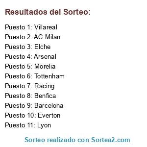 Lista de participantes: Barcelona, Tottenham, Everton, Morelia, Villareal, Benfica, Lyon, Racing, Elche, AC Milan, Arsenal.