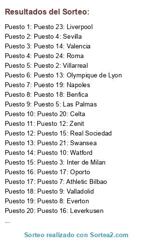 Lista de participantes: Puesto 1: CSKA, Puesto 2: Villarreal, Puesto 3: Inter de Milan, Puesto 4: Sevilla, Puesto 5: Las Palmas, Puesto 6: Milan, Puesto 7: Athletic Bilbao, Puesto 8: Everton, Puesto 9: Valladolid, Puesto 10: Watford, Puesto 11: Wolfsburgo, Puesto 12: Zenit, Puesto 13: Olympique de Lyon, Puesto 14: Valencia, Puesto 15: Real Sociedad, Puesto 16: Leverkusen, Puesto 17: Oporto, Puesto 18: Benfica, Puesto 19: Napoles, Puesto 20: Celta, Puesto 21: Swansea, Puesto 22: Tottenham, Puesto 23: Liverpool, Puesto 24: Roma.